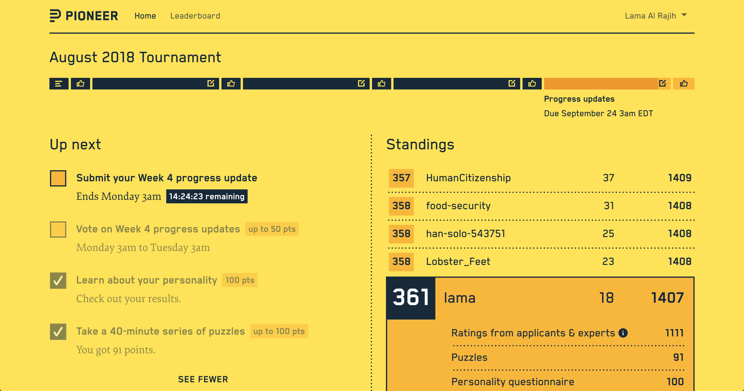 Pioneer is building “a home for all the ambitious outsiders,” which is an enticing mission for everyone without traditional access to the valley or not working on a traditional startup. They run four-week tournaments and you play by simply submitting weekly updates describing the progress you made on your project and by voting and giving feedback on other people’s progress updates. Winners get some money, a plane ticket to the valley, and meetings with Silicon Valley “insider” mentors. Everyone who participates also gets to be part of a community of like-minded peers. Unlike the Silicon Valley, Pioneer doesn’t require you to trade your job to play and also doesn’t limit you to “startups.” The feedback loop is tight and meaningful because it happens weekly and is solely based on the weekly goals you’ve set for yourself. Pioneer nailed most of the elements of what makes for a successful game and leveraged the Internet to recruit players, build a community and eliminate the cost of play.