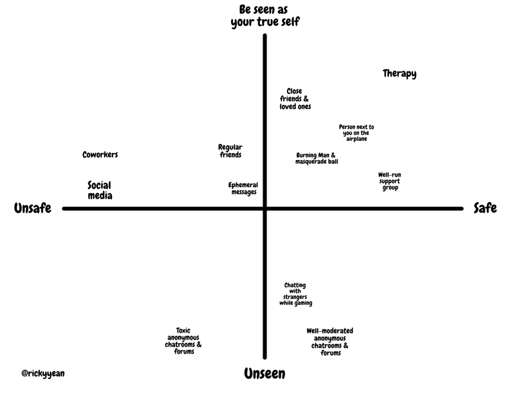 But that’s different from, for example, anonymous forums on the Internet. When you are anonymous, you can say whatever you want, but are you really being seen? Your post could go viral, but the throwaway account will never be traced back to you, so did you actually get away with anything? If you are not seen, then there’s no catharsis. Additionally, anonymous forums are notoriously unsafe because they lead to attacks from others also hiding behind their keyboards.